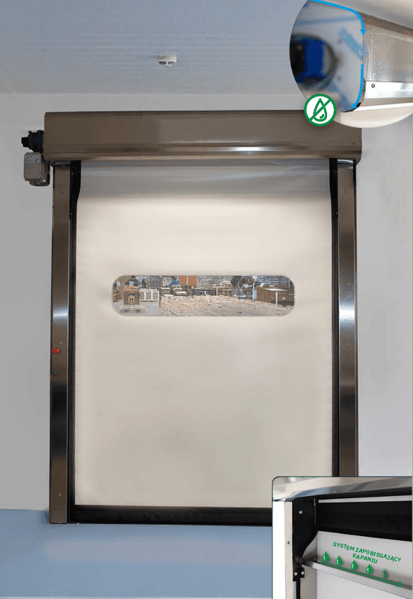 DynaDry to szybkobieżna brama rolowana z systemem samonaprawy, która wykonana jest ze stali nierdzewnej, a jej specjalna konstrukcja zapobiega skraplaniu się i skapywaniu wody na przejście, gdy brama jest otwarta.